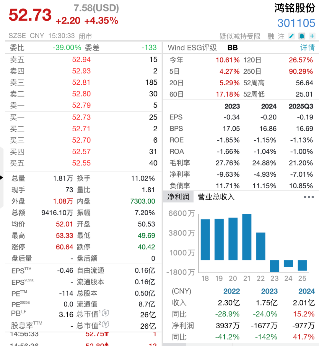 截至2月6日收盘,鸿铭股份涨超4%,报52.73元/股,总市值26亿元。