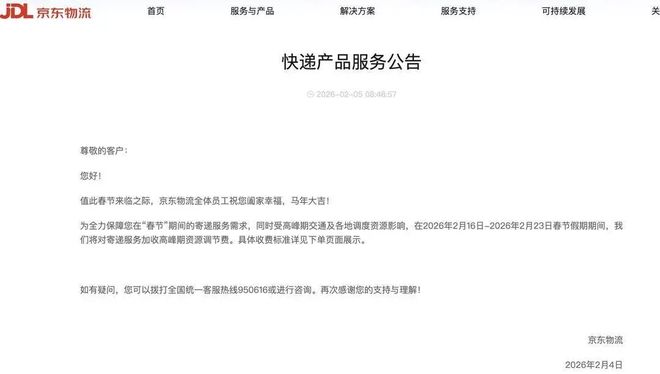 - 京东物流回应称,根据春节期间快递流量情况,部分站点可能会出现排班情况,且会产生资源调度费,具体需以站点为准。据京东物流发布的《快运产品服务公告》显示,受高峰期交通及各地调度资源影响,在2026年1月19日—2026年2月23日期间,将在特快重货产品原价格基础上加收0.1—1.2元/kg的高峰期资源调节费。对部分合作月结的客户,将按照相应的合作产品,分别在不同时间周期加收不同标准的资源调节费。