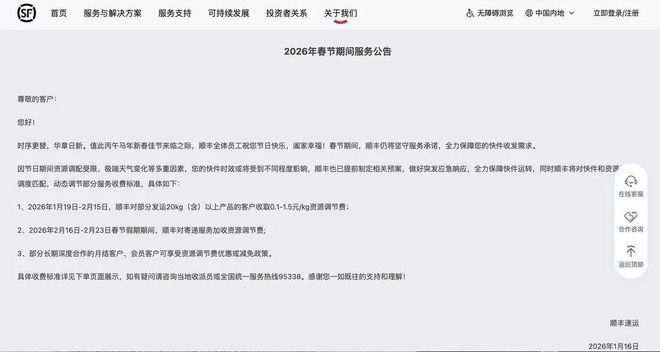 - 顺丰速运、德邦快递客服均回复春节期间不停运,但运输费用会有调整。顺丰小程序上一条公告显示,顺丰会在2月16日至2月23日春节假期期间,对寄递服务加收资源调节费。有媒体从顺丰快递员处了解到,部分区域春节期间会加价10元。