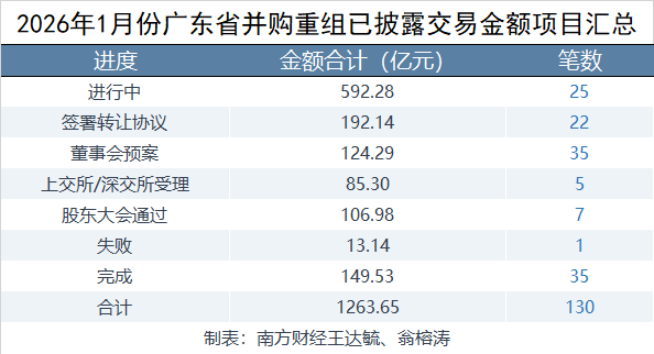 在已披露交易金额的并购重组事件中,本月广东上市公司并购重组金额合计为1263.65亿元,全国占比8.52%;笔数130笔,全国占比12.22%。