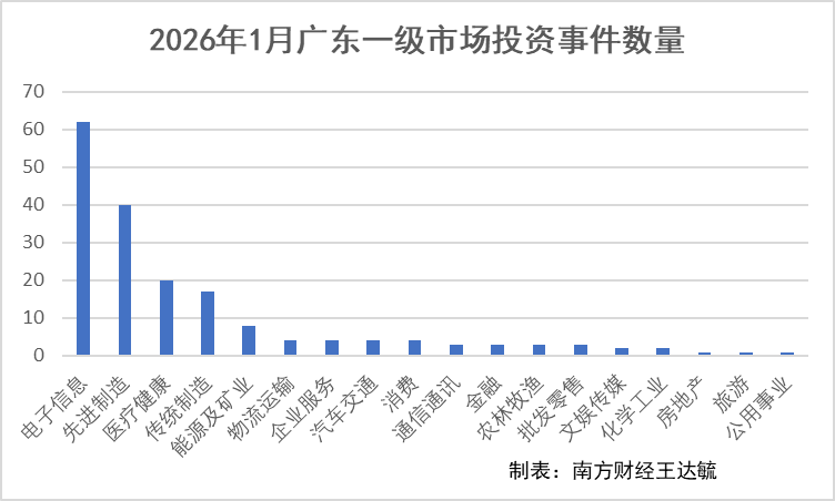 按行业分类,电子信息为本月广东一级市场投资最活跃行业,共发生62起投资事件,先进制造发生40起,医疗健康发生20起,传统制造发生17起。