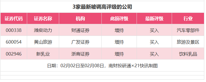评级调高方面,2月2日至2月8日,券商调高上市公司评级达到3家次,最新数据包括了财通证券对潍柴动力的评级从“增持”调高至“买入”,广发证券对黄山旅游的评级从“增持”调高至“买入”,浙商证券对新乳业的评级从“增持”调高至“买入”。