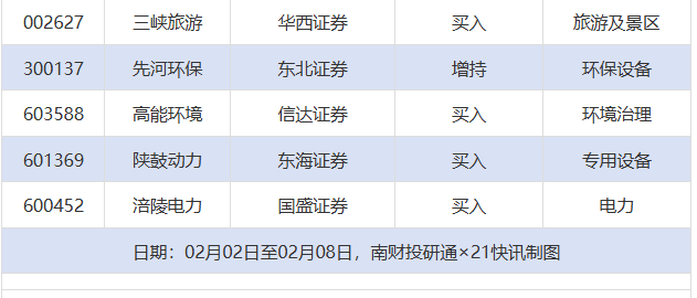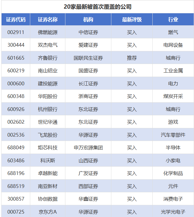 首次覆盖方面,2月2日至2月8日券商共给出了73次首次覆盖,其中佛燃能源获得中信证券给予“买入”评级,双杰电气获得爱建证券给予“买入”评级,齐鲁银行获得国联民生证券给予“推荐”评级,南山铝业获得国盛证券给予“买入”评级,建投能源获得长江证券给予“买入”评级。
