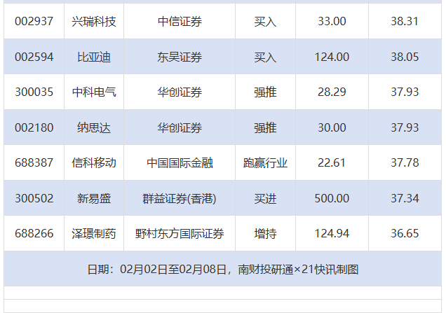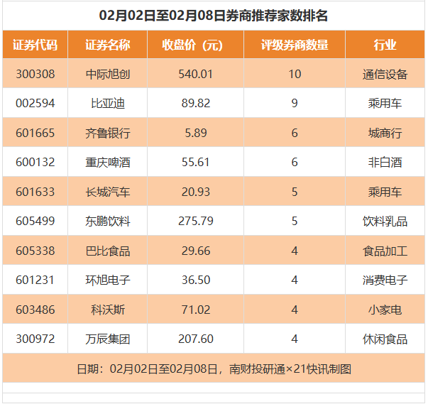 从券商推荐家数来看,2月2日至2月8日有208家上市公司得到券商推荐,其中中际旭创获得10家推荐,比亚迪获得9家推荐,齐鲁银行、重庆啤酒获得6家推荐。