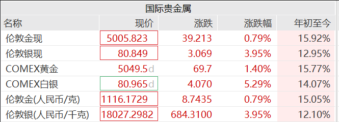 贵金属方面,现货黄金、现货金银快速走高,现货黄金盘中涨超1.5%,突破5040美元/盎司,现货白银向上触及81美元/盎司,涨近4%。国内贵金属期货大涨,铂涨超9%,沪银涨超8%。