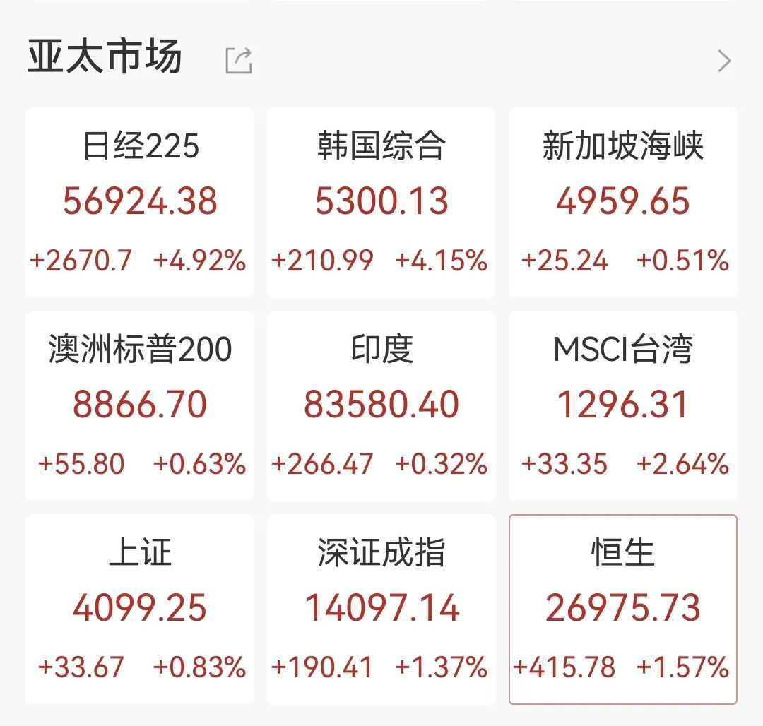 日韩股市大涨,日经225指数大涨近5%,盘中多次创历史新高。软银集团股价涨幅最高达8.5%,创1月28日以来最大涨幅,截至发稿涨超7%。丰田汽车涨超3%,三菱重工涨超4%,日立涨近6%。