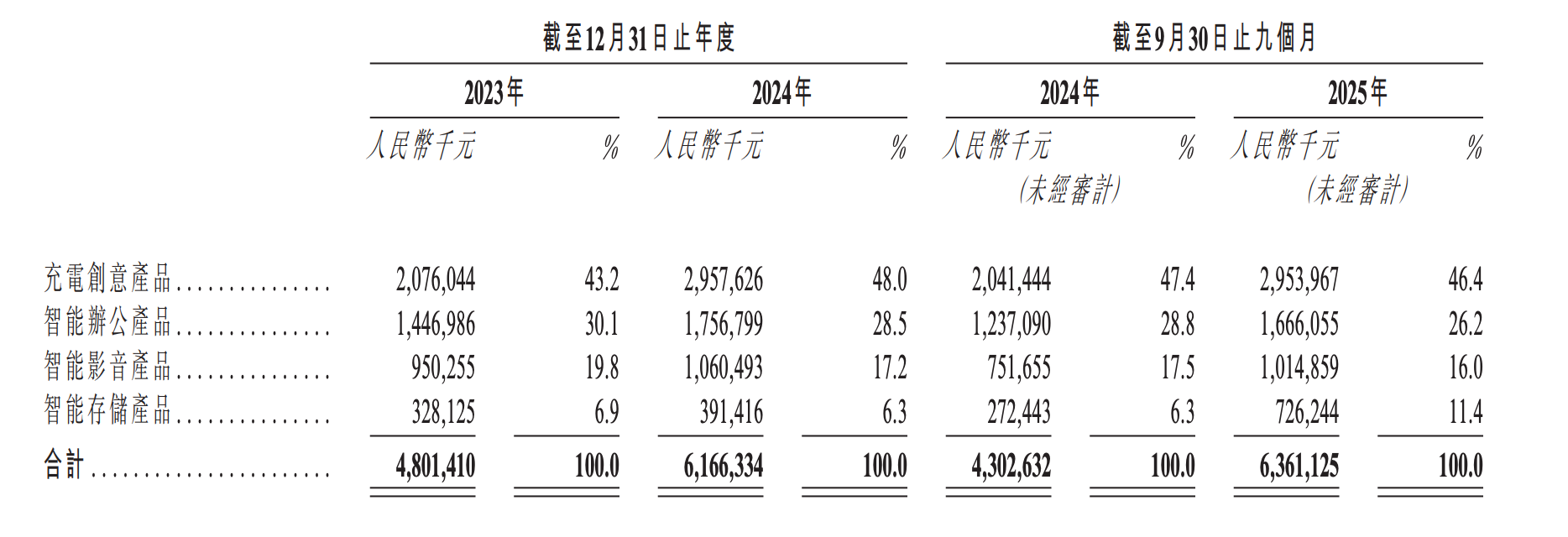 当前,绿联的收入仍由配件类担当。招股书显示,2025年前9月,充电创意产品占46.4%,智能办公产品占26.2%,智能影音产品占16.0%,智能存储产品占11.4%。