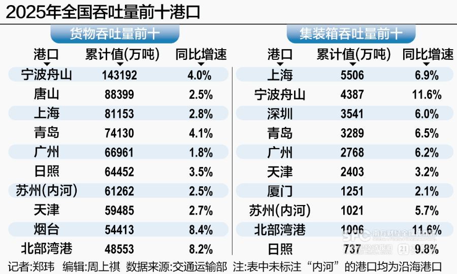 整体来看,2025年全国吞吐量前十港口排名保持稳定。
