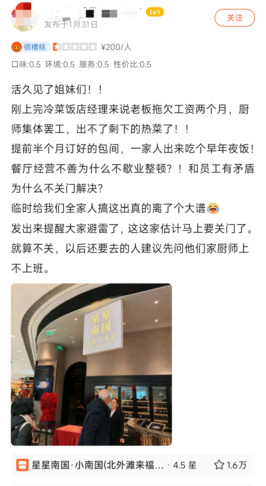实际上,小南国的停业风波并非突然而至。有一位消费者1月底在上海小南国北外滩门店的评价中写道,“刚上完冷菜,饭店经理来说,老板拖欠工资两个月,厨师集体罢工,出不了剩下的热菜了。”而这餐饭是她提前半个月的定好的包厢,为吃年末的家庭聚餐。