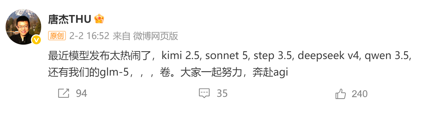 此前,1月8日智谱上市首日,智谱首席科学家唐杰在内部信中就透露即将推出新一代模型GLM-5。2月2日,唐杰发微博明确表示最近智谱将发布GLM-5。
