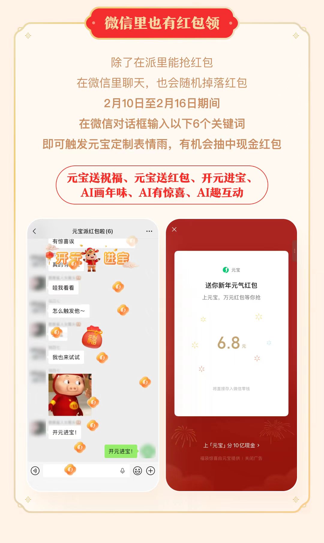2月10日至2月16日期间,在微信对话框输入特定关键词,就可以触发元宝定制红包雨,有机会抽中现金红包。