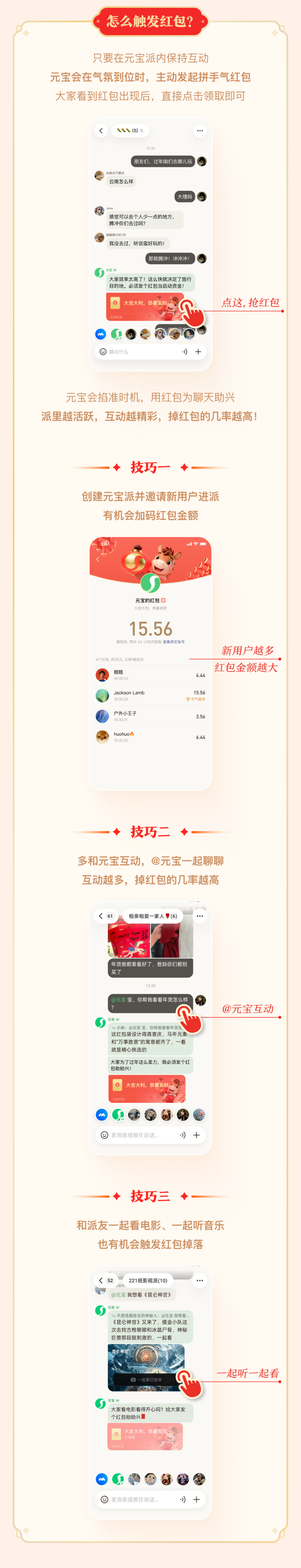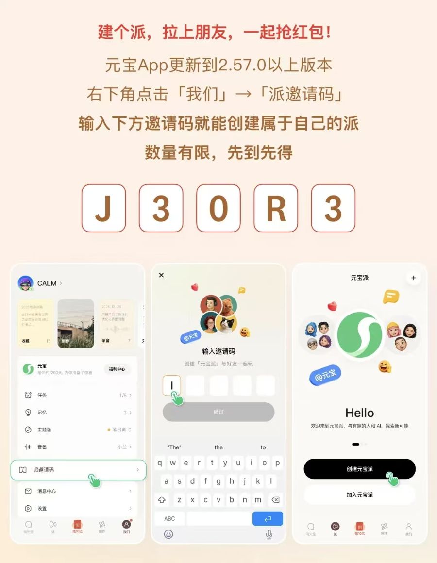 据悉,春节期间,用户创建元宝派、在派内聊天、@元宝互动、派内发起一起听一起看活动,就有机会触发拼手气红包,派内全员都能领,并可快速到账微信钱包。