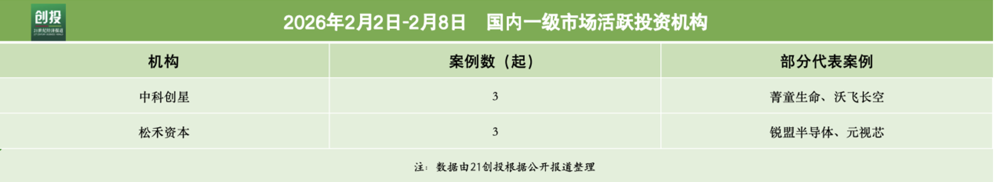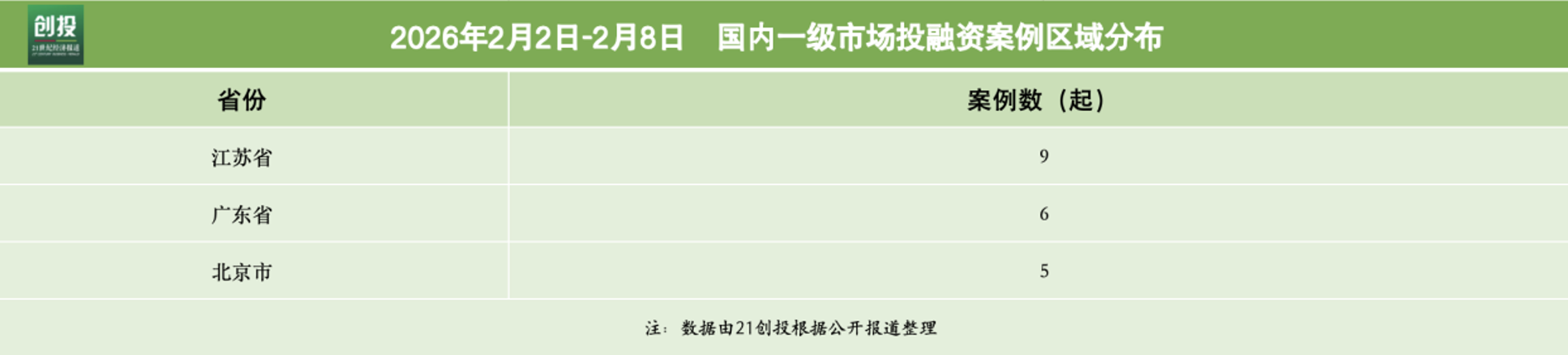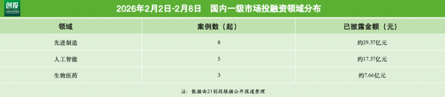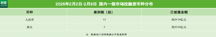 21创投不完全统计,2026年2月2日—2月8日,报告日期内国内一级市场发生融资事件24起。其中,有16笔融资披露了融资金额和币种信息,总规模约合人民币54.4亿元。