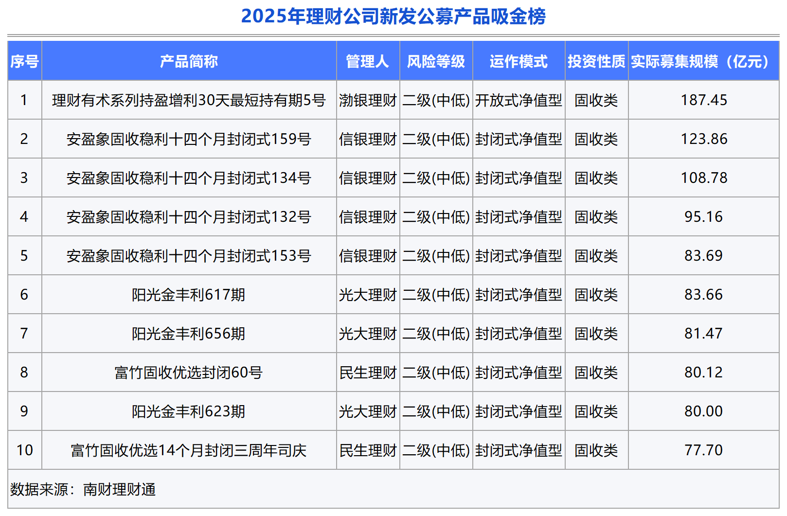 具体到产品情况看,2025年出现了三只募集规模超百亿的产品,其中渤银理财“理财有术系列持盈增利30天最短持有期5号”募集规模排名第一,达到187.45亿元,信银理财两款固收稳利十四个月系列产品排名二、三名,募集规模分别为123.86亿元和108.78亿元,另外排名四、五的产品也是来自信银理财。除上述产品外,光大理财亦有三款阳光金丰利系列产品进入榜单前十,民生理财富竹固收优选系列也上榜了2款产品。