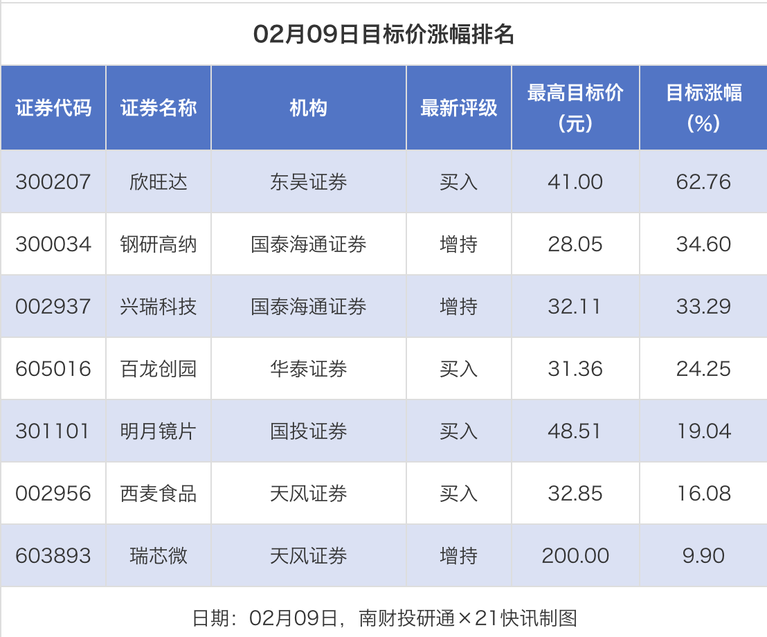 南财投研通数据显示,2月9日,券商给予上市公司目标价共7次,按最新收盘价计算,目标价涨幅排名居前的公司有欣旺达、钢研高纳、兴瑞科技,目标价涨幅分别为62.76%、34.60%、33.29%,分别属于电池、航空装备、汽车零部件行业。