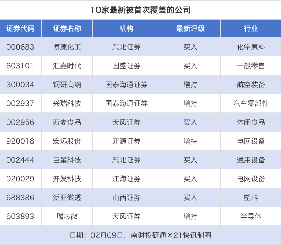 首次覆盖方面,2月9日券商共给出了10次首次覆盖,其中博源化工获得东北证券给予“买入”评级,汇嘉时代获得国盛证券给予“买入”评级,钢研高纳、兴瑞科技获得国泰海通证券给予“增持”评级,西麦食品获得天风证券给予“买入”评级。