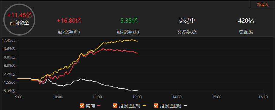 南向资金方面,南向资金早盘净买入11.45亿港元。