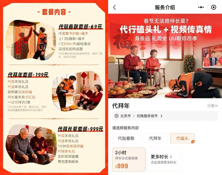 2月9日,UU跑腿推出了一项颇具“新意”的服务——春节代拜年。其中,999元的“代拜长辈套餐”因包含“行传统礼仪”“代磕头”等内容,引发诸多讨论。
