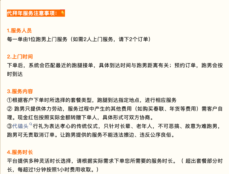 其中,代磕头行礼服务引发热议,随后,账号“无所不能的UU跑腿”在评论区回应:“代拜年磕头服务”旨在为那些因工作、出行等原因无法返乡过年,却仍想向家中长辈传递心意与祝福的人,提供一个暖心的情感联结方式。我们尤其关注空巢老人等需要陪伴的群体,希望借此服务,在节日里为他们送去一份真诚的问候与关怀。