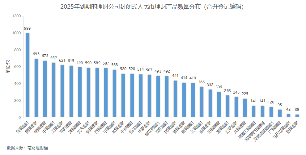 分机构来看,兴银理财2025年到期产品数量逼近千只,招银理财、建信理财、中银理财、工银理财和平安理财到期产品数量均在600只以上,头部理财公司成为产品到期的主要承载主体。