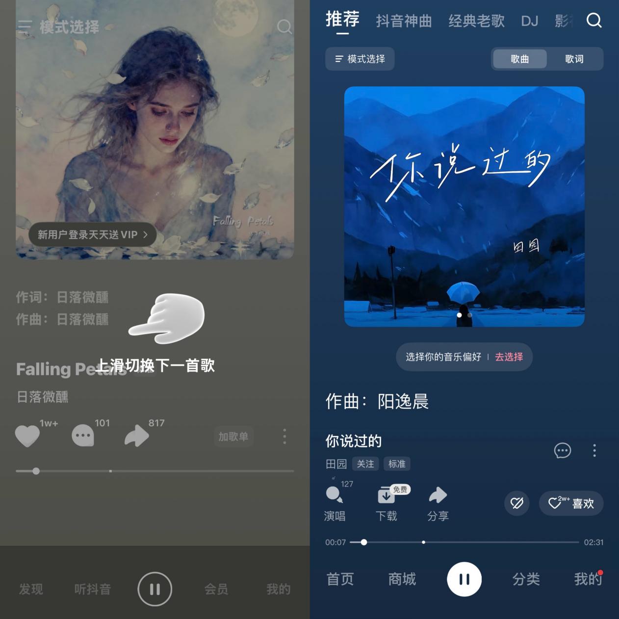 首先,从开屏首页的slogan就可见差异。汽水音乐以“随时随地、懂你所想”营造年轻化的陪伴感,强调算法推荐的“懂你”;番茄音乐则直接展示“热门短剧、DJ、广场舞、K歌”等标签,强调功能与内容导向,更贴近实用与娱乐需求。