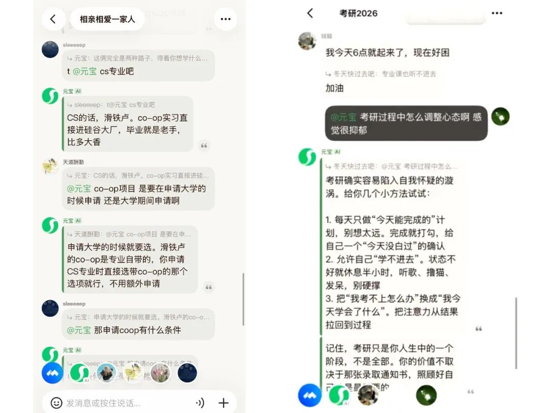 有人把家族群转移到了元宝派,长辈平时转发一些伪科学养生文章,就可以一键@元宝辟谣。还有人创建了打卡读书派,大家各自聊每天看了什么书,有什么感悟,遇到不理解的内容,可以跟派互动请教。