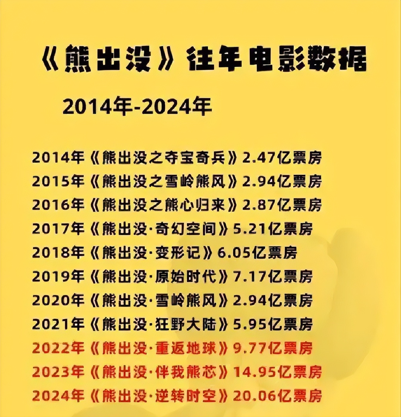 考虑到其极低的制作成本和超高的回报率,《熊出没》堪称中国电影史上最赚钱的电影系列之一。背后的发行方横店影视,以及中影、万达都可能获得不菲的回报。