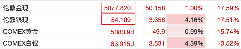 黄金白银冲高回落,截至北京时间23:10,现货黄金上涨1%,站上5070美元,此前最高触及5100美元;现货白银涨超4%,报84.1美元/盎司。