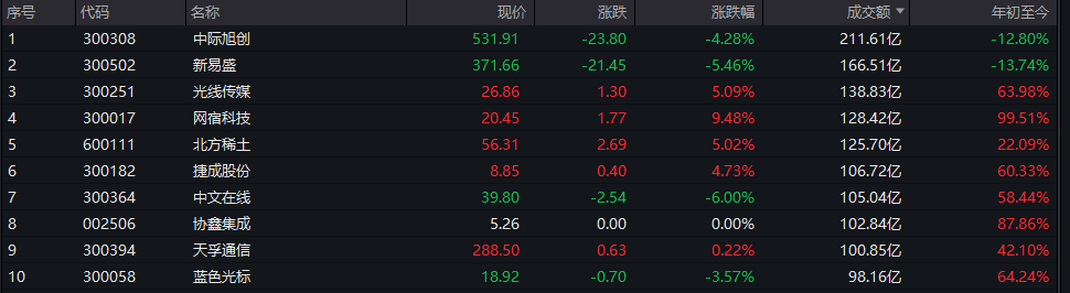 个股方面,中际旭创成交额超211亿元居首,新易盛、光线传媒、网宿科技成交额靠前。