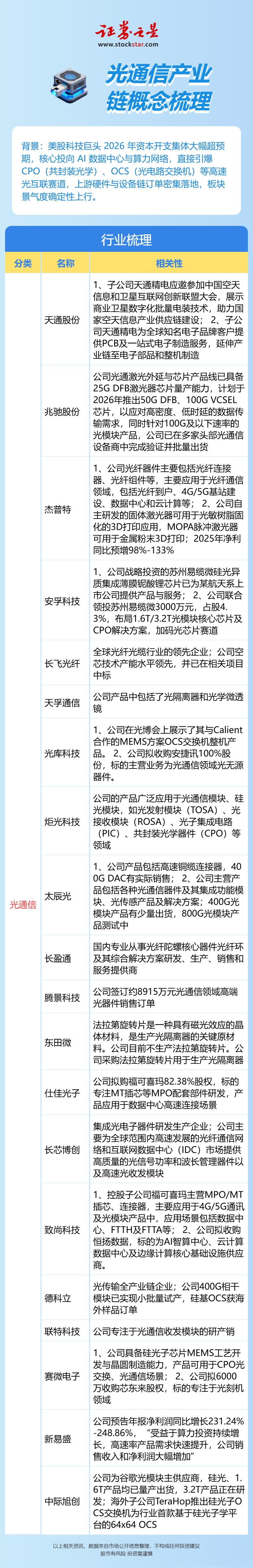 背景:美股科技巨头2026年资本开支集体大幅超预期,核心投向AI数据中心与算力网络,直接引爆CPO(共封装光学)、OCS(光电路交换机)等高速光互联赛道,上游硬件与设备链订单密集落地,板块景气度确定性上行。