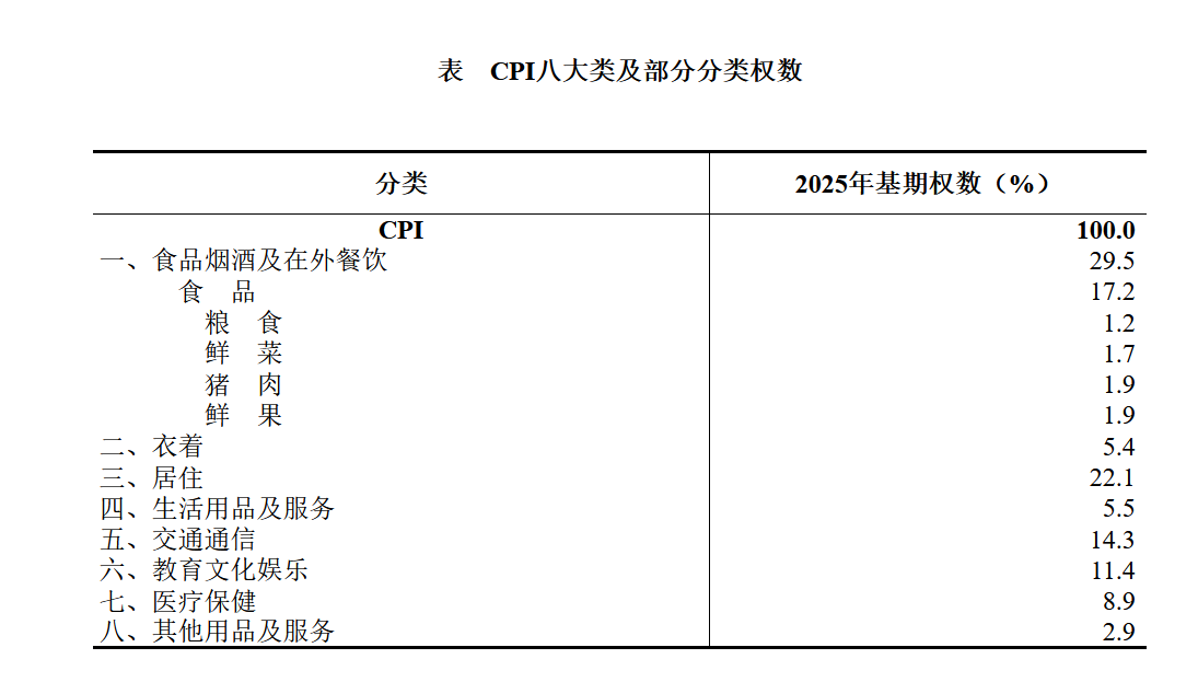 答:CPI权数是指按对比期价格购买“固定篮子”中各类商品或服务的支出占购买整个篮子所需支出的比重。权数来源以住户收支与生活状况调查中居民消费支出资料为主,部分小类和基本分类通过权数专项调查细化补充,并结合其他宏观数据、行业统计资料加以完善,确保权数客观真实反映居民消费结构。具体来看,食品烟酒及在外餐饮、衣着、居住、生活用品及服务、交通通信、教育文化娱乐、医疗保健、其他用品及服务八个大类的2025年基期权数分别为29.5%、5.4%、22.1%、5.5%、14.3%、11.4%、8.9%和2.9%。