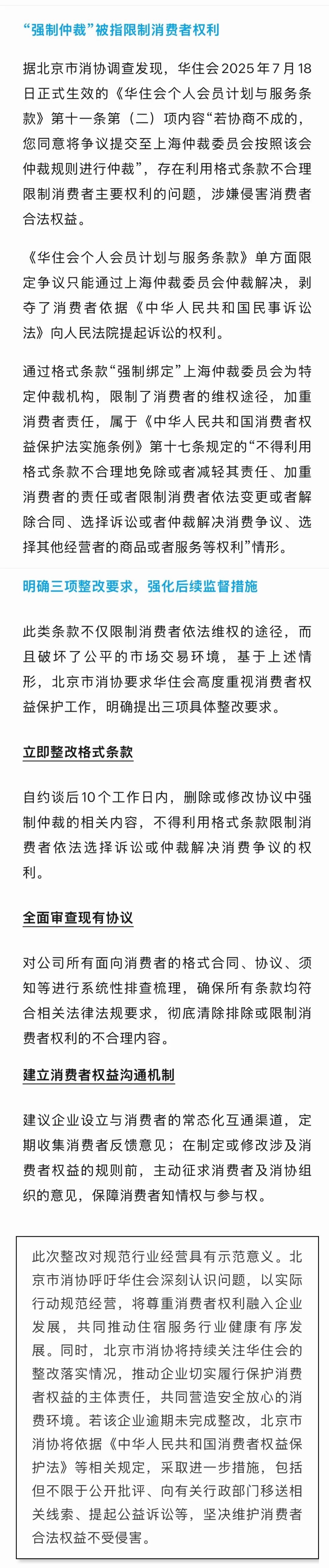 2月11日,针对华住会会员服务协议中涉嫌存在不公平格式条款的问题,依据《中华人民共和国消费者权益保护法实施条例》第四十条“消费者协会可以就消费者投诉的损害消费者合法权益的行为开展调查,与有关经营者核实情况,约请有关经营者到场陈述事实意见、提供证据资料等”规定,按照中国消费者协会《消协组织消费维权约谈经营者办法(试行)》,北京市消费者协会(以下简称“北京市消协”)对其运营方——汉庭星空(上海)酒店管理有限公司进行约谈,明确指出该公司相关条款中涉嫌存在排除、限制消费者主要权利的情况,损害消费者的合法权益,并要求其进行全面自查和限期整改。