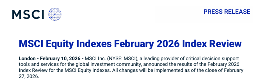 北京时间2月11日凌晨,国际指数编制公司MSCI公布了其2026年2月的指数季度调整结果,本次调整结果将于2026年2月27日收盘后生效。2月份的季度调整公布了MSCI全球标准、MSCI全球小盘、MSCI全球微小盘等主要指数系列的新增、剔除名单。MSCI此次季度评审不涉及A股纳入因子变化。