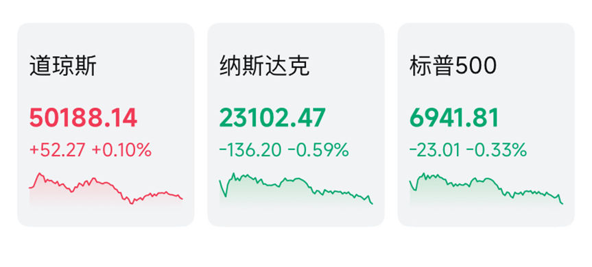 当地时间2月10日,美股三大股指收盘涨跌不一。截至收盘,道指涨0.1%报50188.14点,续创收盘新高,标普500指数跌0.33%报6941.81点,纳指跌0.59%报23102.47点。