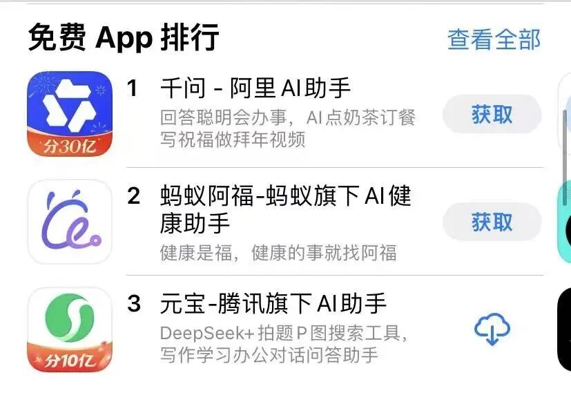 2月11日,苹果App Store中国区免费应用排行榜显示,千问、蚂蚁阿福下载量猛增,包揽总榜前二。