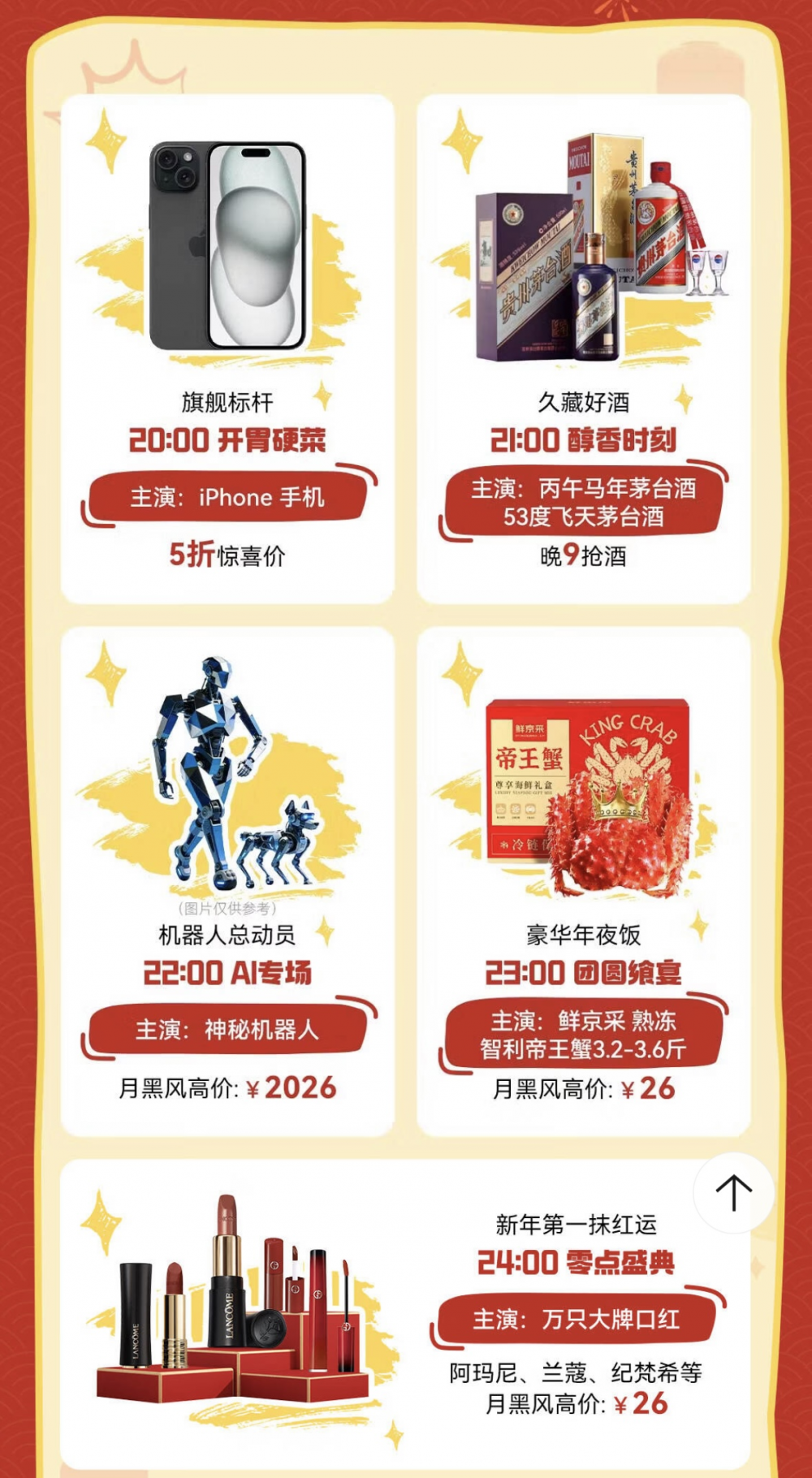 此外,随着新年钟声即将敲响,京东跨年福利再度加码!晚上11点,超3斤重的智利帝王蟹仅售26元。零点跨年时刻,更有阿玛尼、兰蔻、纪梵希等上万支大牌口红以26元惊喜价压轴登场。