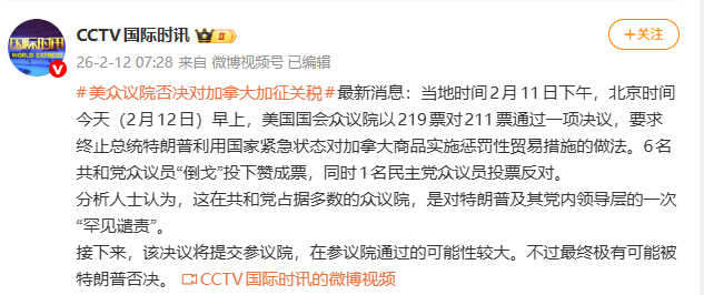 当地时间2月11日下午,北京时间今天(2月12日)早上,美国国会众议院以219票对211票通过一项决议,要求终止总统特朗普利用国家紧急状态对加拿大商品实施惩罚性贸易措施的做法。6名共和党众议员“倒戈”投下赞成票,同时1名民主党众议员投票反对。
