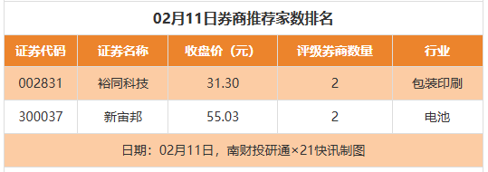 从券商推荐家数来看,2月11日有14家上市公司得到券商推荐,其中裕同科技、新宙邦均获得2家推荐,维信诺等获得1家推荐。