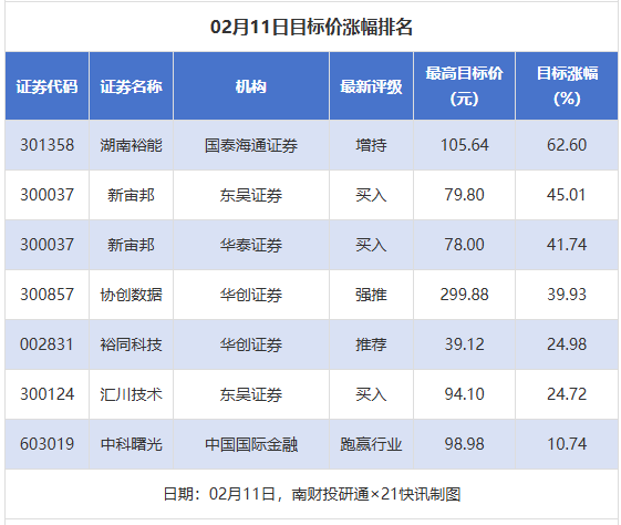 南财投研通数据显示,2月11日,券商给予上市公司目标价共7次,按最新收盘价计算,目标价涨幅排名居前的公司有湖南裕能、新宙邦,目标价涨幅均超40%,均属于电池行业。此外,协创数据、裕同科技、汇川科技目标价涨幅均超20%。