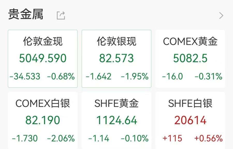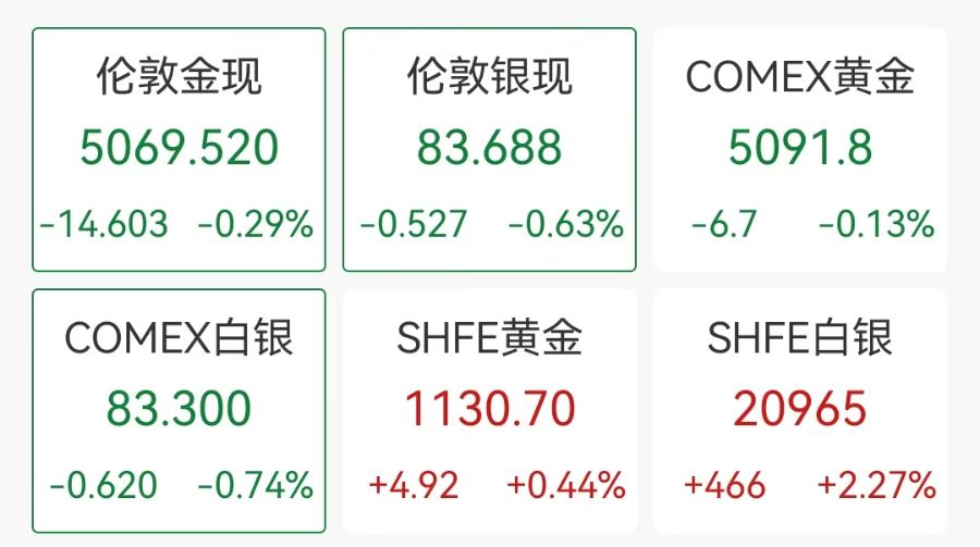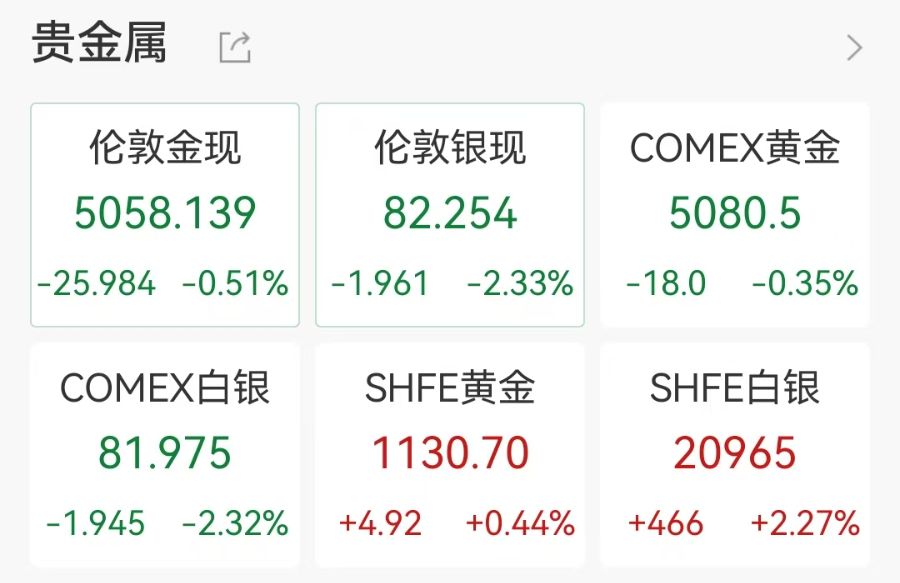 截至目前,现货黄金报5058.139美元/盎司,跌0.51%;COMEX黄金报5080.5美元/盎司,跌0.35%。现货白银和期货白银均跌超2%。