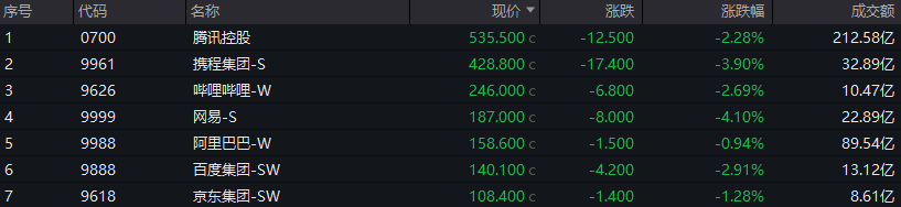 互联网科技股普遍下挫,哔哩哔哩跌2.7%,快手跌2%,阿里巴巴跌0.95%,腾讯控股跌2.3%。