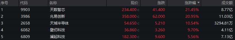 半导体股大幅上涨,兆易创新涨超20%,壁仞科技涨近10%,澜起科技涨5.56%。