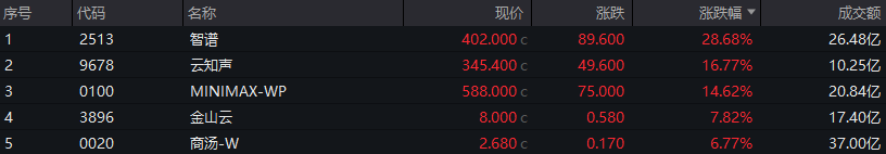 大模型板块走高,智谱涨近30%,MINIMAX涨14.6%。