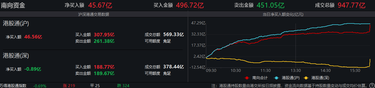 南向资金方面,当天南向资金净买入额达45.67亿港元,沪股通和深股通分别为净买入46.56亿港元和净卖出0.89亿港元。