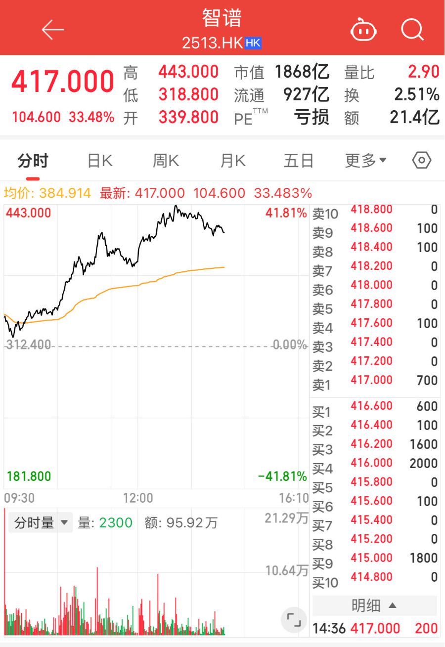 2月12日,“全球大模型第一股”智谱AI(2513.HK)股价大幅走强,盘中一度涨超40%,截至当日13时36分,股价报417港元/股,涨幅超30%,总市值突破1700亿港元。