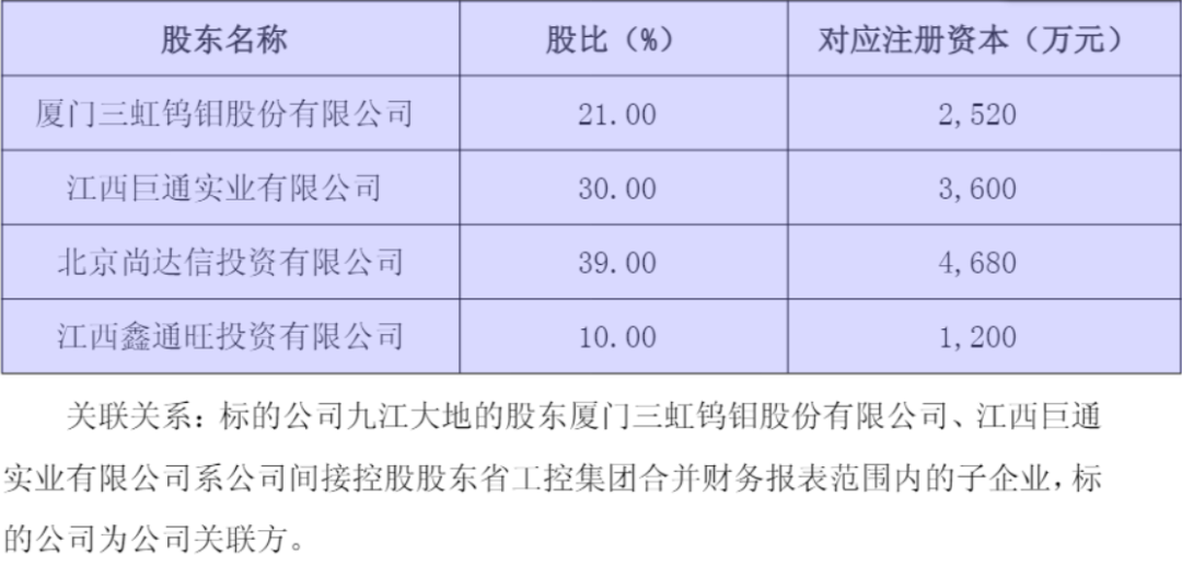 股权方面,厦门三虹钨钼股份有限公司(以下简称“厦门三虹”)、江西巨通实业有限公司(以下简称“江西巨通”)、尚达信、江西鑫通旺投资有限公司分别持有九江大地21%、30%、39%、10%的股权。其中,厦门三虹和江西巨通均为省工控集团合并财务报表范围内的子企业,九江大地因此构成厦门钨业的关联方。