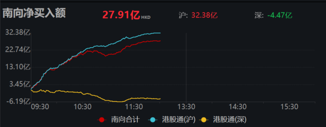 南向资金方面,早盘南向资金净买入近28亿港元。
