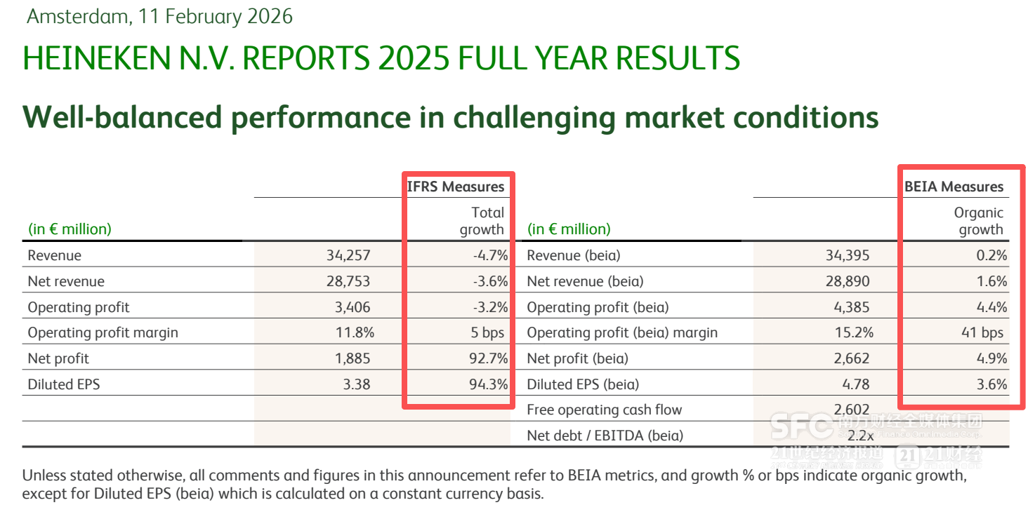 不过按照喜力更愿意采用的BEIA口径(剔除特殊项目及收购相关无形资产摊销),过去一年虽然销量微降,收入、利润双双实现增长——按BEIA口径,2025年喜力集团净收入288.9亿欧元,有机增长1.6%;营业利润43.85亿欧元,有机增长4.4%。