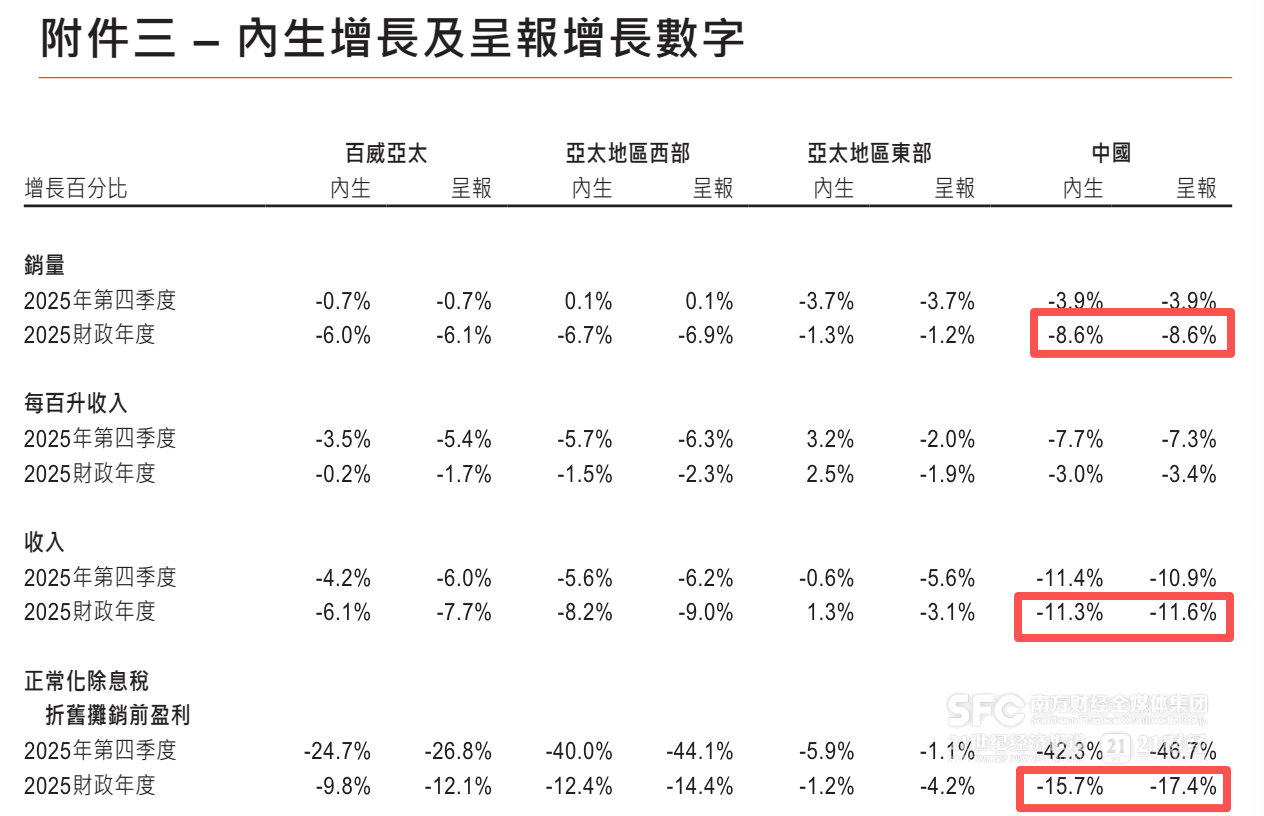 2025年,按照内生口径,百威在中国的收入同比下滑11.3%、正常化除息税折旧摊销前盈利同比下滑15.7%,销量同比下滑8.6%。