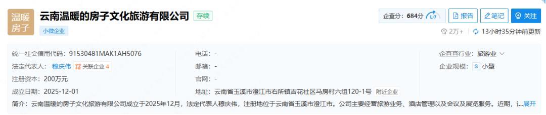 云南省玉溪市澄江市投资促进局对媒体证实,当地已启动相关土地平整工作;而承担该项目的主体——云南温暖的房子文化旅游有限公司,则已于2025年12月在澄江市右所镇马房村先行完成注册。